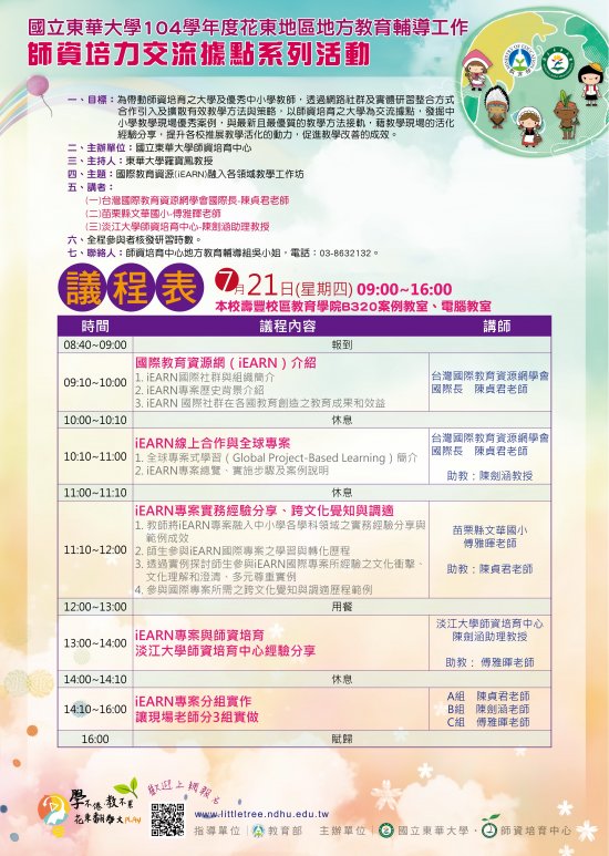 轉知~104學年度師資培力交流據點系列活動-《國際教育資源(iEARN)融入各領域教學工作坊》教師踴躍報名參加
